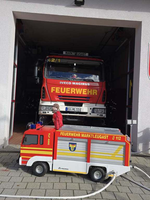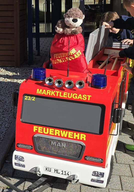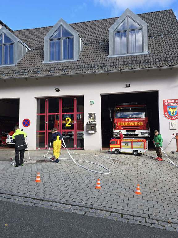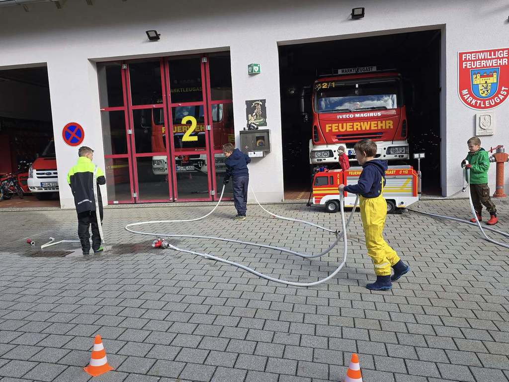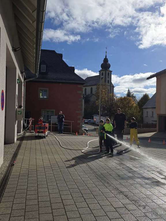 Im Anschluss fuhren die Kinder ihr eigenes Tanklöschfahrzeug auf den Vorplatz, wo auch geübt wurde.
